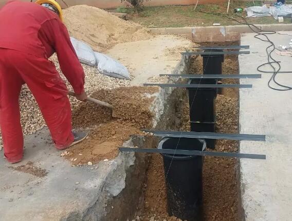回填砂石,回填至距离地面30cm左右,浇水沉降2小时候后夯实。