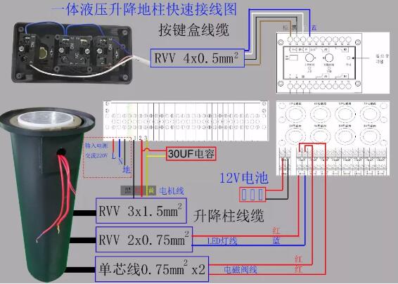 RVV4*2.0电线为电机线,一条为接地线,另外三条与升降柱相接,黑色为公共线,红色为上升,黄色为下降,红色和黄色需要接入。