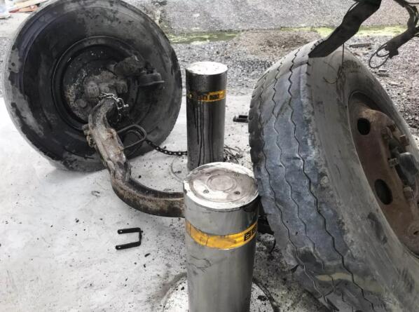 经过猛烈碰撞后,百胜BS602升降地柱外观无明显变形,且能正常升降,表现优异!