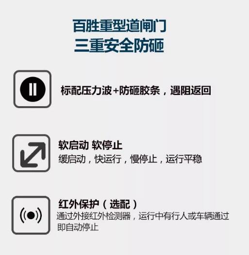 重型道闸门宜安装压力防砸或红外防碰装置,在升降过程中检测到障碍物信号时可自动返回到一定距离或停止,以有效的保护过往人员、物体及车辆。
