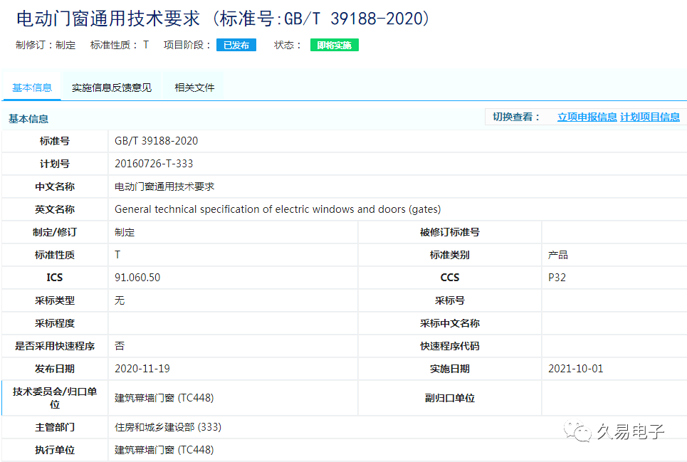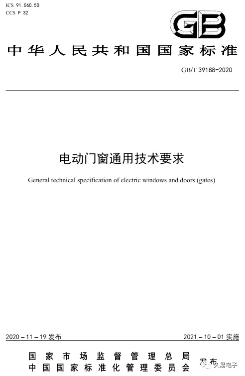 近日,国家市场监督管理总局和国家标准化管理委员会发布2020年第26号中国国家标准公告,由全国建筑幕墙门窗标准化技术委员会归口管理,中国建筑金属结构协会、中国建筑科学研究院有限公司、浙江久易电子科技股份有限公司等单位起草的国家标准GB/T 39188-2020《电动门窗通用技术要求》于2020年11月19日发布,将于2021年10月1日正式实施。