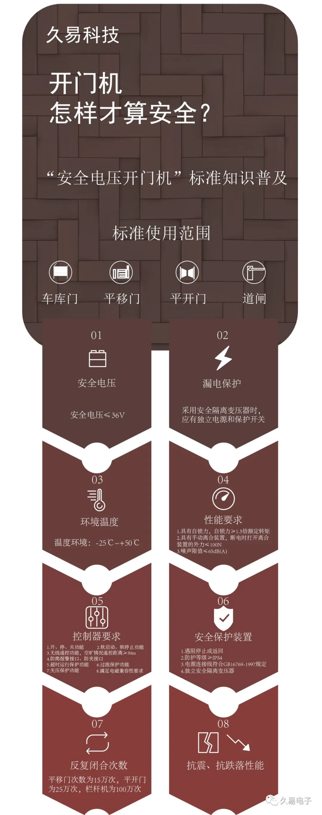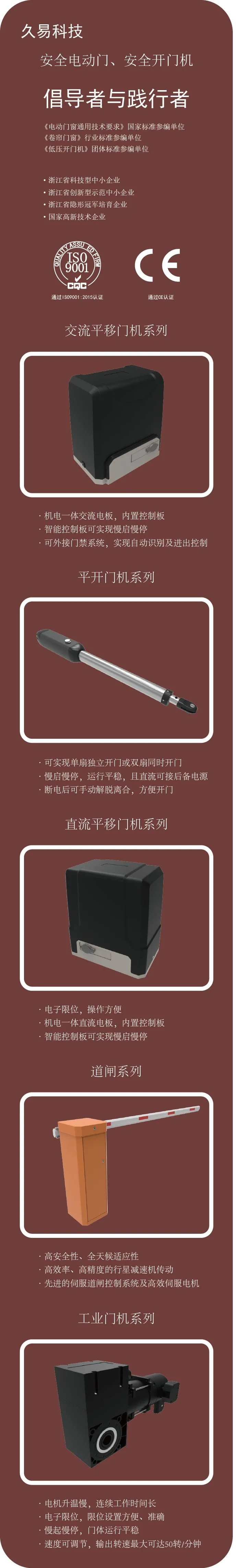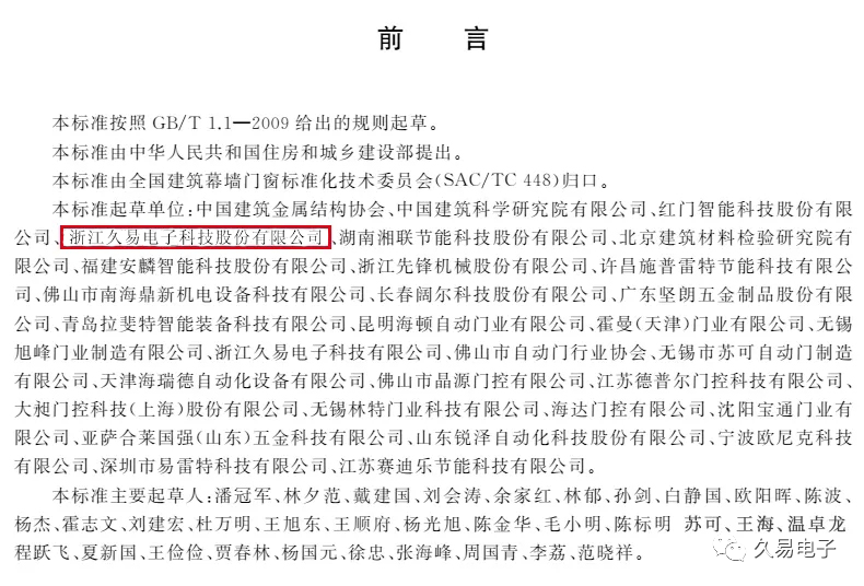 浙江久易电子科技股份有限公司作为此项国标的参编单位,主要参与了电动门、电动开门机、室内门等通用技术要求的内容编订,标准的制定和实施对提高国内电动门窗产品的质量水平和安全性能,杜绝人身伤亡事故的出现,引导和规范市场健康有序发展,助力行业提升产品和服务供给质量,提升用户体验,营造智能高效的出入环境具有重要现实意义。