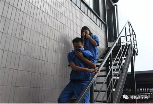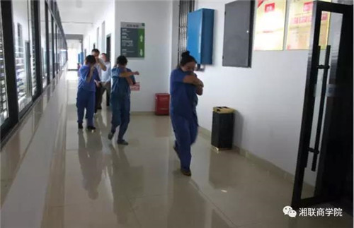 员工进行模拟疏散逃生演练,大家有序撤离火灾现场。