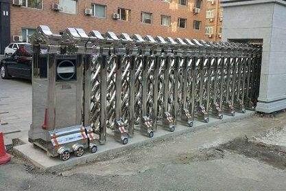 3、电动伸缩门技术指标:1)门体伸开后,每个节距≤410mm;2)导线布置应合理,导线中间不允许有接头;3)机头有警示标志,用反光膜制作;4)机头上的电机装置必须有防雨装置;5)外露面不应有明显划伤、污渍,凸凹不平的缺陷;6)门体完全伸开后,门立框的晃动量应≤20mm;7)门体缩合后,相邻门立框的上下间距差应≤10mm;8)门体缩合后,相邻立框的高低相关:组装框应≤10mm,弯曲框应≤10mm;9)门体缩合后,各铰接杆不齐偏差应≤5mm;10)遥控器:距离应≥30m;b、抗电强度:1500V?50Hz/1min应不击穿;c、无闪络,门体尾部应设置接地装置。