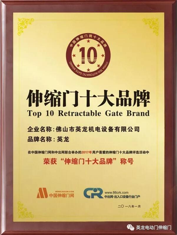 佛山市英龙机电设备有限公司,亚洲知名电动门生产制造企业,17年来专注电动伸缩门技术研发,荣获中国伸缩门十大品牌,广交会进出口贸易全球合作伙伴等荣誉等。