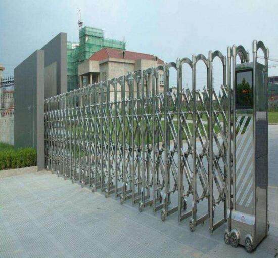 舟山电动伸缩门门体采用优质不锈钢及铝合金专用型材制作,采用平行四边形原理铰接,伸缩灵活行程大,给蓝绿和园项目不一样的体验。